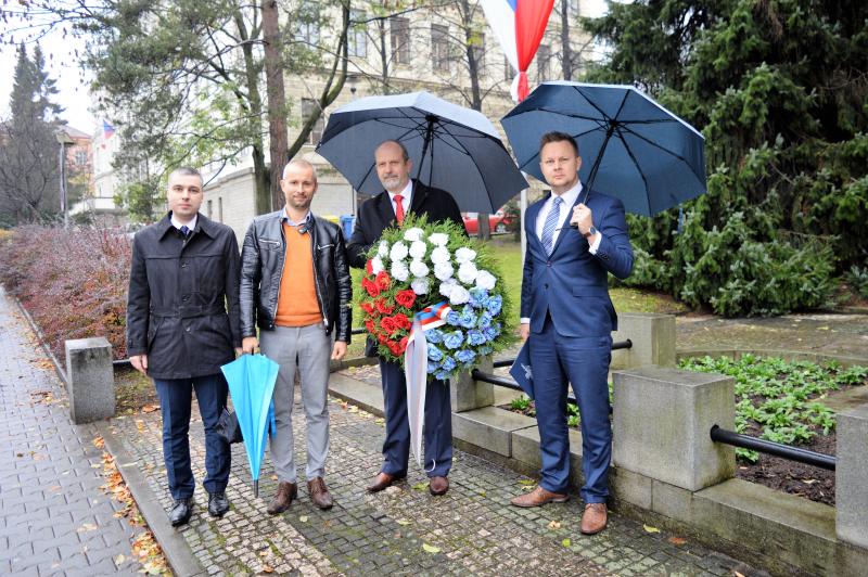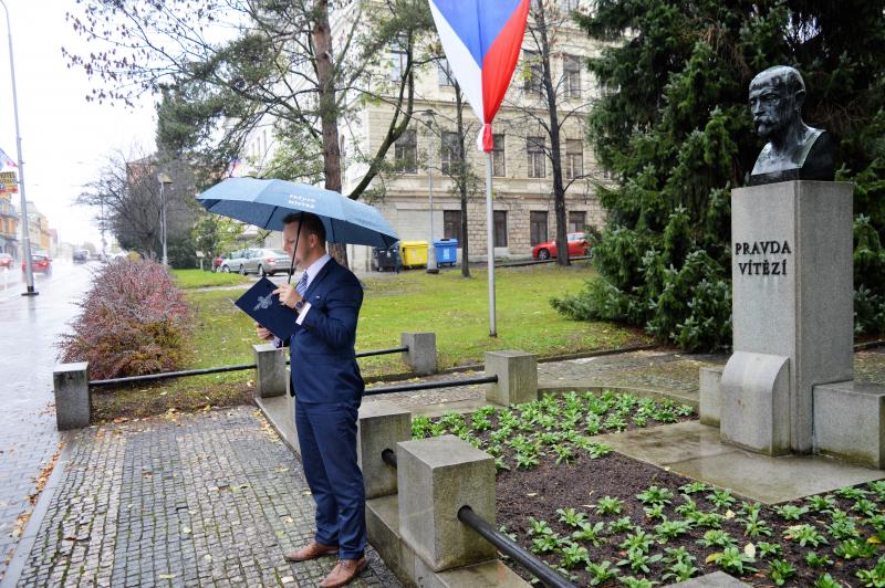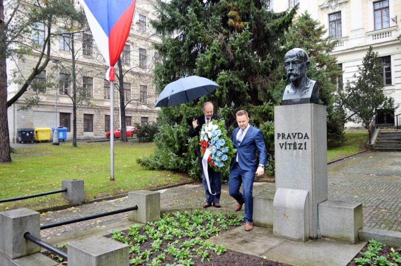 Jak proslov z historických pramenů připomněl, k pádu Habsburků a dalších dvou evropských panovnických dynastií přispěly politické důsledky 1. světové války. A též jedna válečná událost před 100 lety. Bitva u Zborova 2. července 1917 byla sice jen jednou z mnoha bitev 1. světové války, ale z pohledu vojenského významu položila základy československé zahraniční armády. Čechoslováci tu bojovali s obrovským nasazením v touze zvítězit. Bitvy se zúčastnila příští vojenská elita první republiky. „Zákon o vzniku samostatného československého státu potvrdil, že národy Čechů a Slováků v srdci Evropy žijí, že se neztratily ve víru válečných událostí a našly odvahu hledat svou vlastní identitu. Nebylo by to možné bez takových výrazných osobností, k jakým patřil i zakladatel československého státu Tomáš Garrigue Masaryk,“ zaznělo u památníku prvního prezidenta. Vedení města položením květin u jeho busty vzdalo hold Prezidentu Osvoboditeli, především jeho odvaze bojovat o lepší budoucnost Čechů a Slováků, i všem našim předkům, kteří se v pohnutých časech historie svými morálními postoji a činy zasloužili o humánnější a pokojnější budoucnost.
