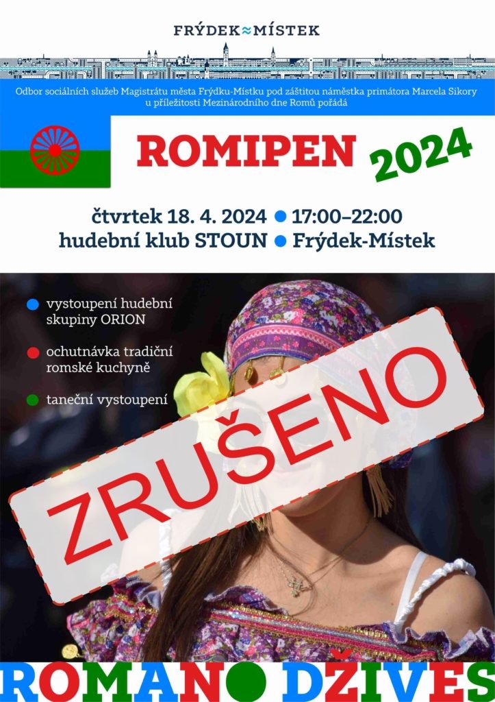 Vážení občané, dovolujeme si Vám oznámit, že akce ROMIPEN, plánovaná na 18. 4. 2024 v Hudebním klubu Stoun, je z personálních důvodů zrušena.