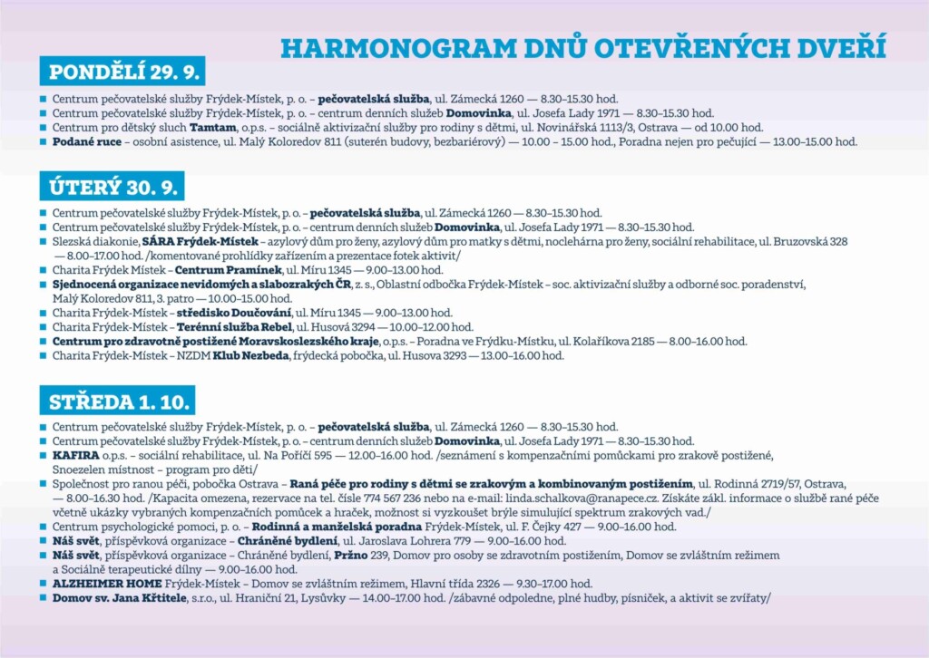Po celé republice se akce konají v termínu od pondělí 29. září do neděle 5. října. Ve Frýdku-Místku se budou lidé ve dnech od 29. září do 3. října moci podívat například do pečovatelské služby na Zámecké ulici, do denního centra Domovinka, azylového domu pro ženy SÁRA nebo do Domova pro seniory na 28. října, také vyzkoušet si kompenzační pomůcky pro zrakově či sluchově postižené a mnoho dalšího. Připravené jsou workshopy a besedy s tématy jako například canisterapie, raná péče pro rodiny s dětmi se zrakovým postižením, finanční gramotnosti nebo oddlužení.