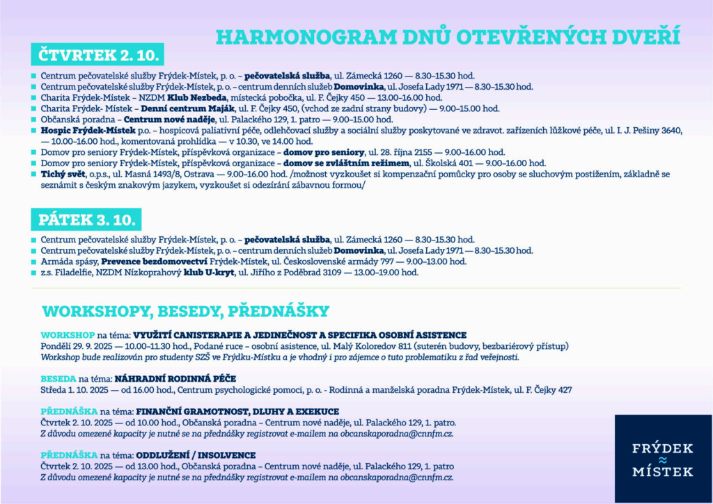 Seznam poskytovatelů sociálních služeb ve Frýdku-Místku, kteří otevřou své dveře veřejnosti a připravili doprovodné aktivity pro veřejnost i odborníky, najdete níže včetně termínů konání.