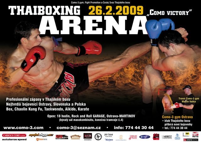 Včerejší Aréna se povelda, a ze spousty stran slyšíme že to bylo to nejlepší. Bude pro nás těžké sestavovat další Arény aby zápasy byly tak nastřílené jako ted. Dekuji bojovníkům za výbornou přípravu a skvělé výkony. Dokázali jsme v z peti zápasů 4 krát vyhrát a jednou remizovat. Opět zaplněná hala přivítala bojovníky z Polska, Slovenska a výběr České republiky. Dorazily taky silné skupiny fanoušku ze Slovenska a Polska. Řádný kotel, taková Aréna 16 byla velká vřava v zápasech Muay-Thai. První zápas za Como nastoupila Martina Botyanszká proti Šatalové ze Slovenska. Martina měla bohužel osobní problem a taky to bylo vidět v zápase. Přesto jsem byl s ní spokojen a výsledek remíza byl zasloužený. Druhý bojovník nastoupil Tomáš Kantor a co ten předvádí ve svém druhém zápase je neuvěřitelné. Musíte všichni šlapat ať jsou naše zápasy takové. Bojovník z Polska se bil jako lev (i když to Poláci vždycky). Tomáš vítězí jasně na body 3:0. Třetí zápas v podání Toma Kendziora a zástupce Scospion gym byla jako vždy štípaná od začátku do konce. Jak jinak by ale zápas Tomáše mohol skončit než v třetím kole kdy dokázal zase zápas obrátit KO rukou na bradu. Předposlední bojovník a zároveň top České republiky ve váze 67 kg Jakub PRETORIÁN Gazdík dostal velmi obávaného soupeře a známého knockoutéra Maroše LITTLE TYSON Pačana Vicechampiona WMC z Thajska. Hned od prvního kola bylo jasné že Pačan bude pro nás oříšek. Kuba hrál předepsanou hru. A zničeho nic přišel neskutečný hák a Kuba byl počítán a hodně otřesen. Na osmou se pokračovalo dál. Kubovi se hned podařilo trefit Pačanovi kop na hlavu lehce jej otřást. Od té doby naordinovaná taktika ala zápas Buakaw vs Masato. Několik desítek přímých kopu na hlavu Pačana a kopy na stehna. To taky rozhodlo Gazdík vítězí v zápase, který si přeje každý fanoušek M-T 2:0 na body. Como victory. Poslední zápas a druhá topka tentokrát ve váze 63,5 kg v České republice Patrik CANNIBAL Neuwirth (Mistr ČR ČSTB, Mistr Ostravy, Mistr Slovenska STB) vs Jan Moncol (Mistr ČR CMTA, účastník mistrovství evropy a světa). Tento zápas na 5 kol sliboval krásný zápas. První kolo jak už je u Patrika zvykem technicky projel a sázeli jsme na jeho fyzičku a urputnost. V prvním kole se podařilo dostat Moncola do počítání. Druhé kolo ostřejší začátek a Patrik se už prosazoval více a je tady druhé počítání. Třetí kolo rozhodlo a Patrik CANNIBAL Neuwirth vítězí KO. Como victory Aréna 16 se povedla zápasy neuvěřitelné. Kdo nebyl nemusí smutnit celý turnaj zábírala Česká Televize a to nejlepší brzo uvidíte všichni. Aréna 16 Como victory. Obrovské poděkování patří mojí ženě Lence a Maximusovi který byl poprvé v ringu. Taky zkušenému a luxusnímu moderátorovi Tomášovi Vzorkovi. Díky patří ČSTB a Pavlu Petráskovi, vytvořil silnou základnu bojovníků a budoucích šampionu. Přes něj vede cesta aby byl Thajský box v ČR na špičkové úrovni. Samozřejmě poděkování všem partnerům bez nich ani ring nepostavíme DĚKUJEME!!! Velmi se snažili aby byli zápasy super taky kluci u ringu Ervin, Michal, Kuba díky je to i vaše vítězství. A kdyby nebylo našich Como brigádníků tak budeme taky boxovat na poli. Díky všem co můžou za nejlepší Arénu 16 „Como victory“