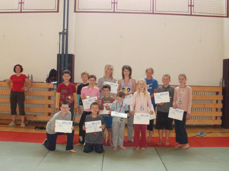 Trenér oddílu TJ Důl Staříč Lubomír Černý je hned po řádné rozcvičce provedl těmi nejzákladnějšími technikami, jako jsou pády a jednoduché chvaty boje na zemi. Nabyté vědomosti si děti hned vyzkoušely v mini prázdninovém turnaji. Všichni kluci i holky byli samozřejmě patřičně ohodnoceni sladkou medailí a diplomem.