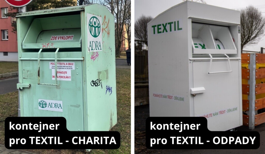 - Do kontejnerů TEXTIL – CHARITA patří textil, který je vhodný pro další potřebu – využití, zejména zachovalé čisté a suché oblečení, obuv či hračky. Tyto kontejnery provozuje dobrovolnické centrum Adra, o.p.s.