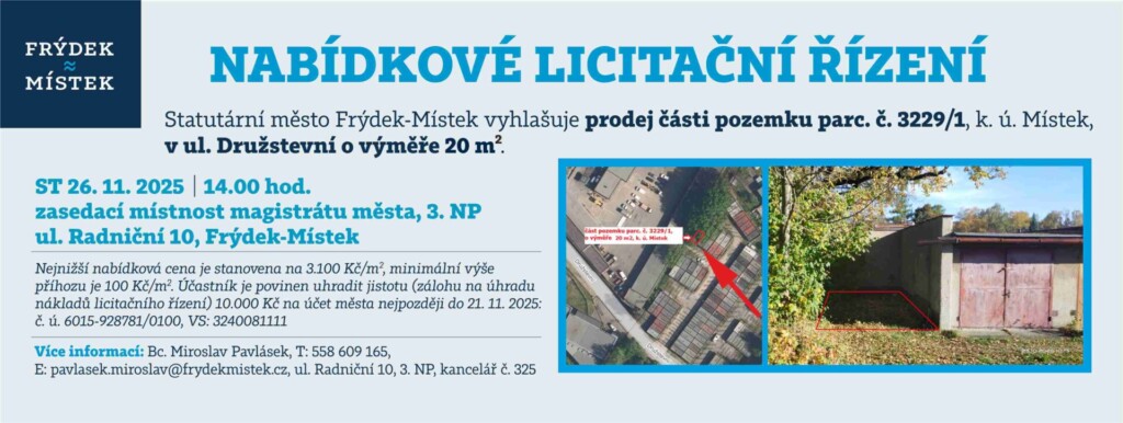 Statutární město Frýdek-Místek vyhlašuje záměr prodat níže uvedenou část pozemku parc. č. 3229/1, k. ú. Místek, v ul. Družstevní o výměře 20 m². Nabídkové licitační řízení se uskuteční ve středu 26. listopadu 2025 od 14 hodin v zasedací místnosti magistrátu města, odbor správy obecního majetku /3. NP/, ul. Radniční 10, Frýdek.