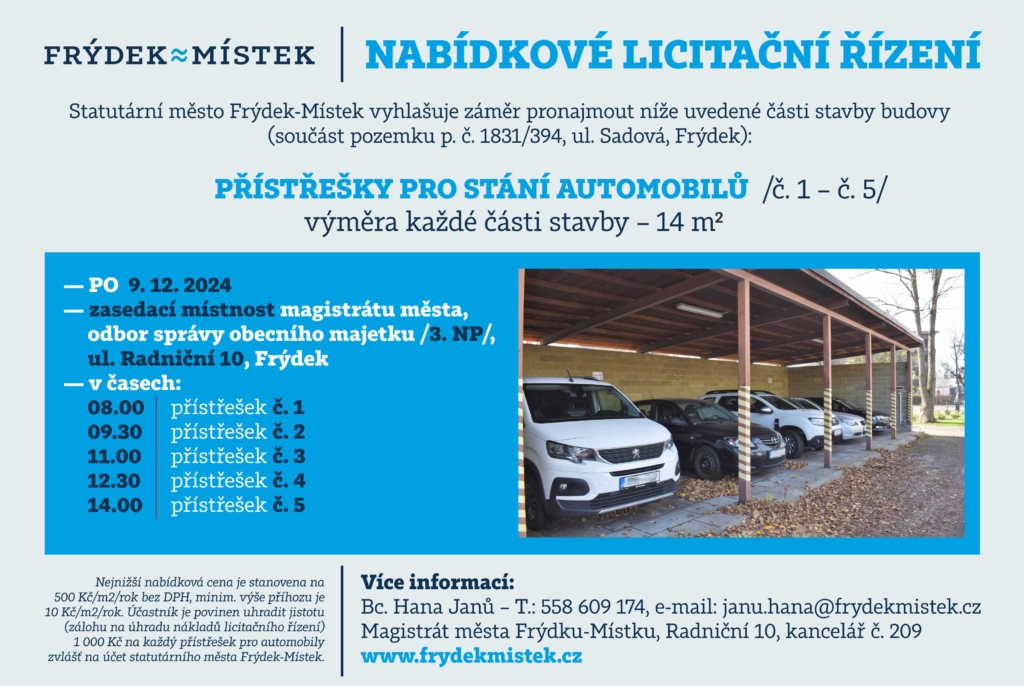 Statutární město Frýdek-Místek vyhlašuje záměr pronajmout níže uvedené části stavby budovy- přístřešky pro stání automobilů. Nabídkové licitační řízení se uskuteční v pondělí 9. prosince 2024 v zasedací místnosti magistrátu města, odbor správy obecního majetku /3. NP/, ul. Radniční 10, Frýdek.