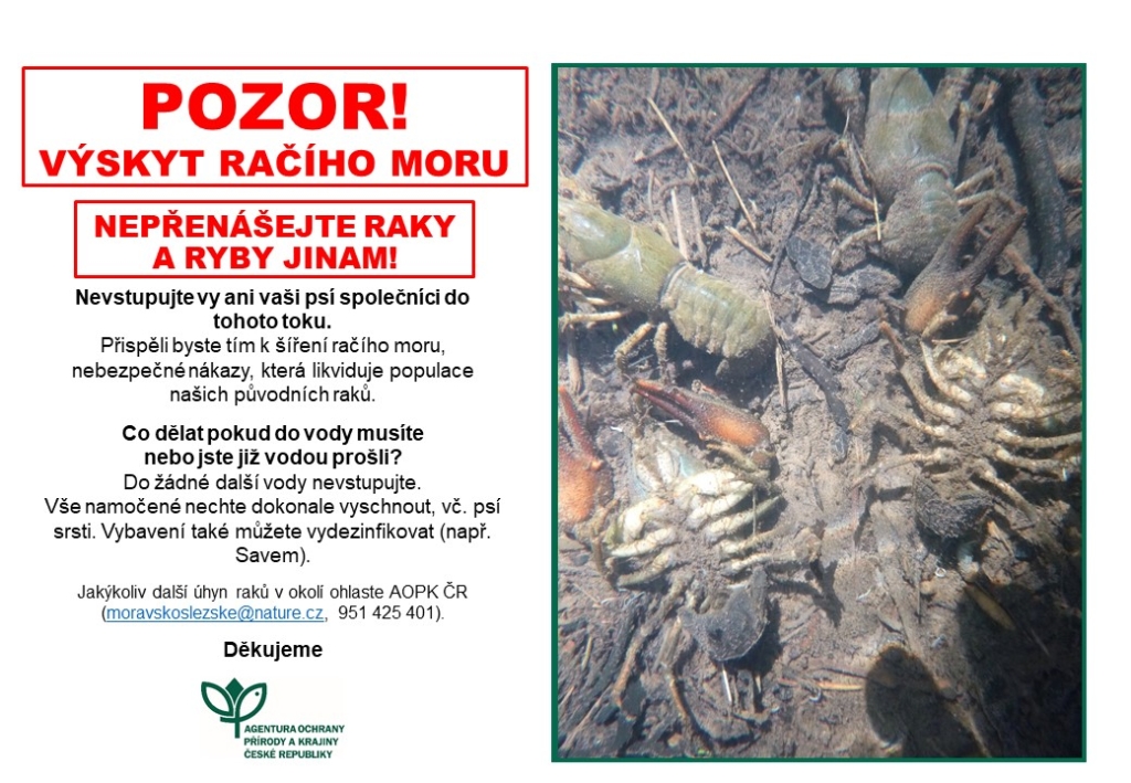 Pokud máte podezření na račí mor nebo jste přímo objevili uhynulé raky v Beskydech či na území Moravskoslezského kraje – s jedinci nemanipulujte a kontaktujte Agenturu ochrany přírody a krajiny ČR, regionální pracoviště Moravskoslezské: E: moravskoslezske@nature.cz; T: 951 425 401.
