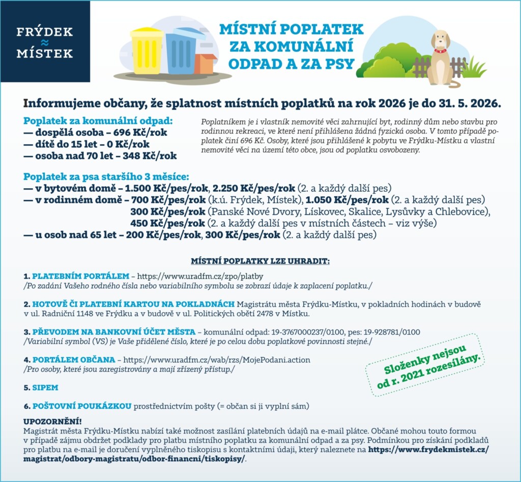 Informujeme občany, že splatnost místních poplatků za rok 2026 je do 31. 5. 2026. Složenky nejsou od roku 2021 rozesílány.