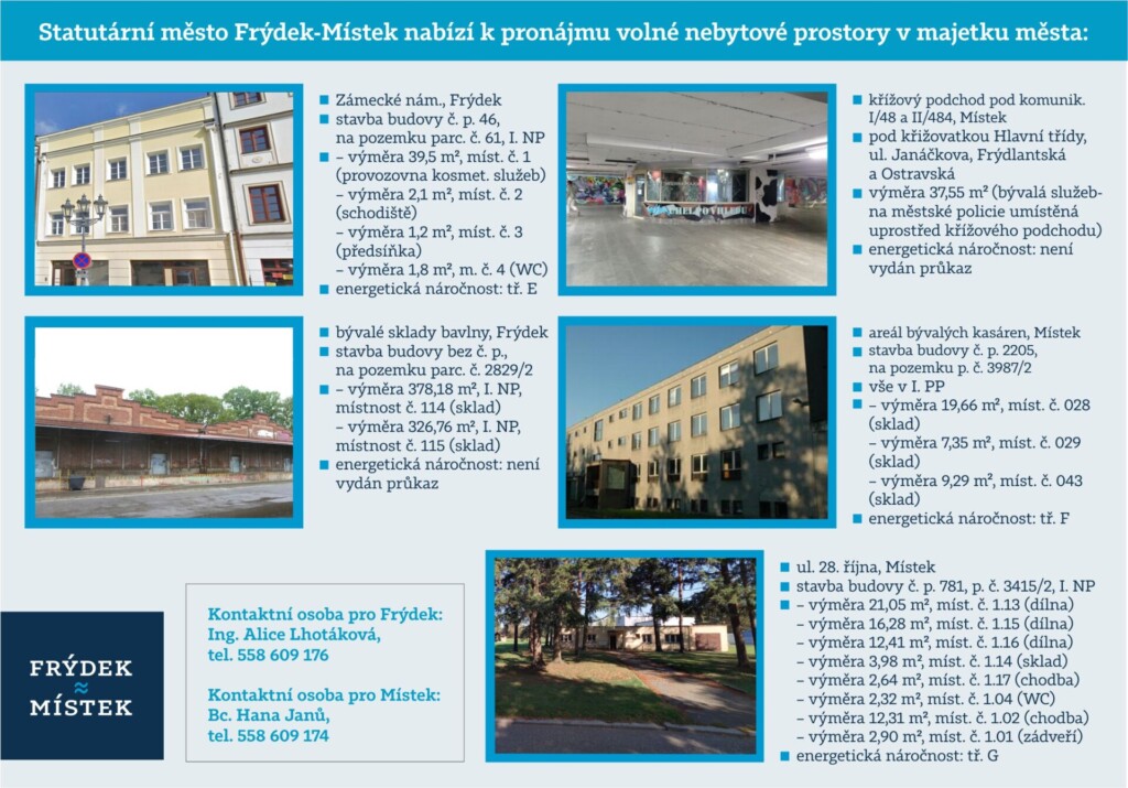 Sháníte volný nebytový prostor ve Frýdku-Místku? Nabízíme Vám k pronájmu volné nebytové prostory v majetku města. Pro více informací kontaktujte paní Ing. Alici Lhotákovou (Frýdek- 558 609 176) a paní Bc. Hanu Janů (Místek- 558 609 174).