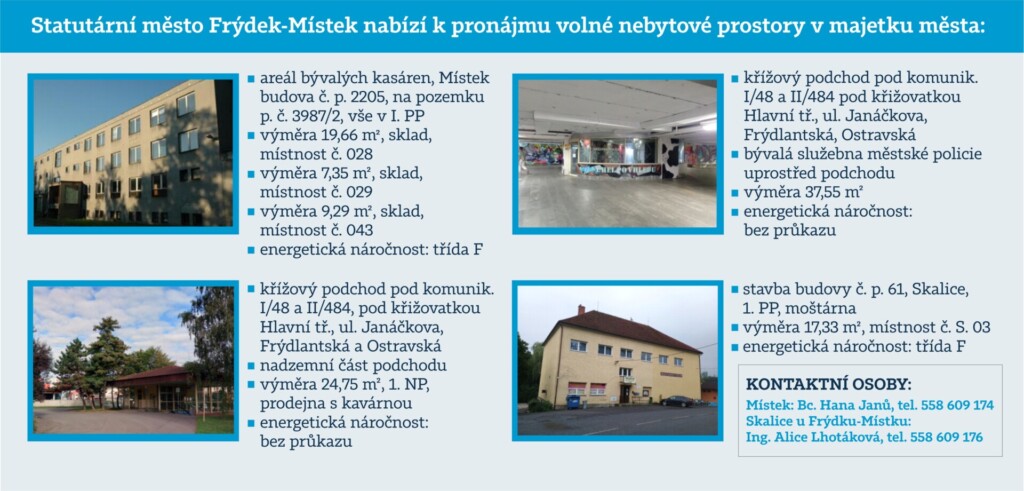 Sháníte volný nebytový prostor ve Frýdku-Místku? Nabízíme Vám k pronájmu volné nebytové prostory v majetku města. Pro více informací kontaktujte paní Ing. Alici Lhotákovou (Místek – 558 609 176) nebo Bc. Hanu Janů (Skalice – 558 609 174).