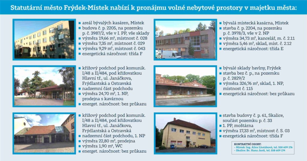 Sháníte volný nebytový prostor ve Frýdku-Místku? Nabízíme Vám k pronájmu volné nebytové prostory v majetku města. Pro více informací kontaktujte paní Ing. Alici Lhotákovou (Místek – 558 609 176) a paní Bc. Hanu Janů (Skalice – 558 609 174).