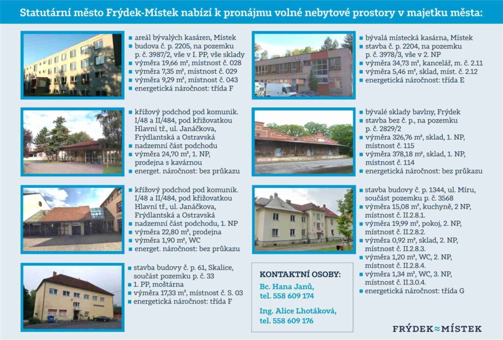 Sháníte volný nebytový prostor ve Frýdku-Místku? Nabízíme Vám k pronájmu volné nebytové prostory v majetku města. Pro více informací kontaktujte paní Ing. Alici Lhotákovou (Místek – 558 609 176) nebo Bc. Hanu Janů (Skalice – 558 609 174).
