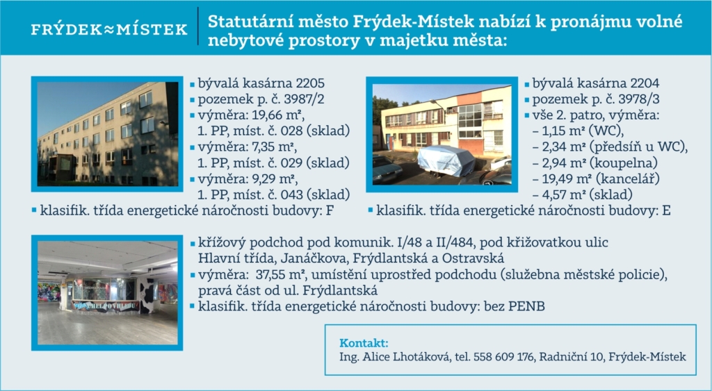 Sháníte volný nebytový prostor ve Frýdku-Místku? Nabízíme Vám k pronájmu volné nebytové prostory v majetku města. Pro více informací kontaktujte paní Ing. Alici Lhotákovou (558 609 176).