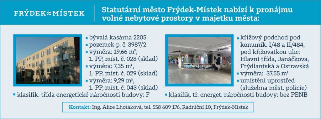 Sháníte volný nebytový prostor ve Frýdku-Místku? Nabízíme Vám k pronájmu volné nebytové prostory v majetku města. Pro více informací kontaktujte paní Ing. Alici Lhotákovou (558 609 176).