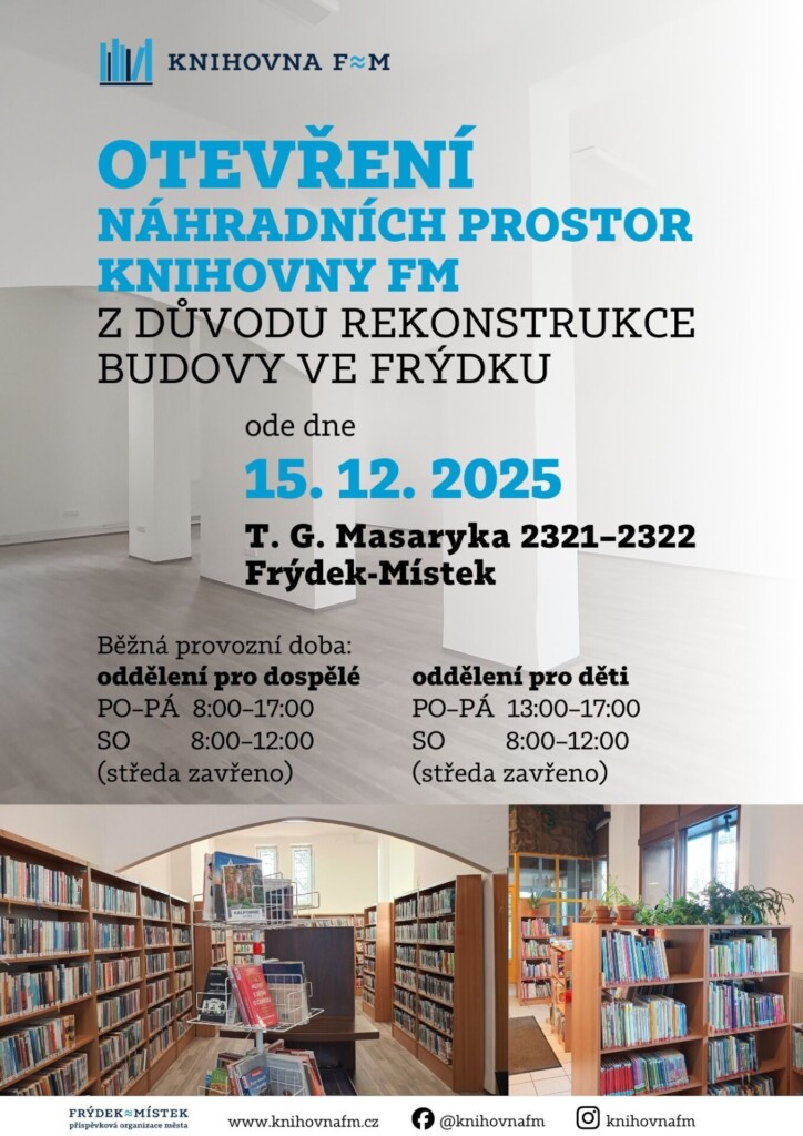 Informujeme čtenáře, že oddělení pro dospělé a oddělení pro děti a mládež bude otevřeno v náhradním provozu na ulici T. G. Masaryka 2321–2322 od 15. prosince 2025.