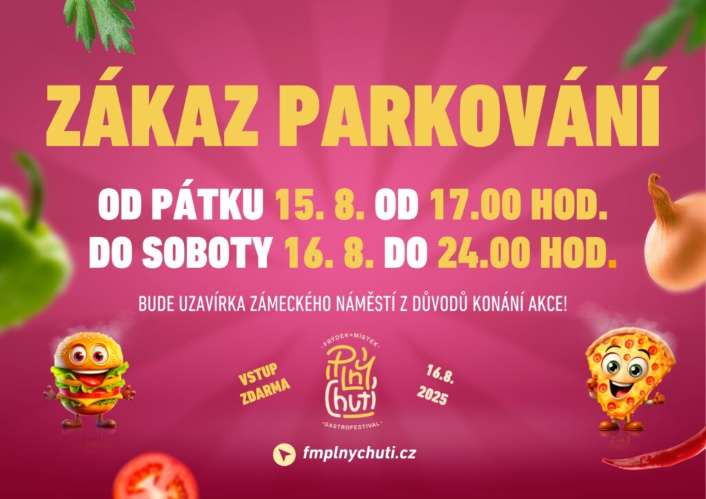 Z důvodu konání akce „Frýdek-Místek plný chutí“ bude od pátku 15. 8 od 17 hodin do soboty 16. 8 do 24:00 zákaz parkování na Zámeckém náměstí ve Frýdku.