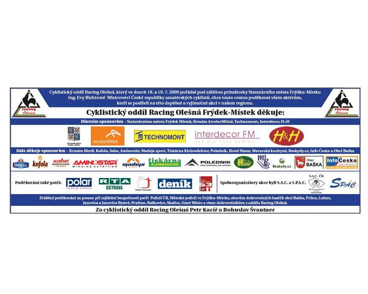 ZPRAVODAJ F-M srpen 2009 č. 15 Silniční MČR amatérských cyklistů Frýdecko-místecký cyklistický oddíl Racing Olešná uspořádal úspěšně silniční mistrovství amatérských cyklistů. Nedělní silniční závod odstartovala primátorka Frýdku- Místku Eva Richtrová. „Veškerá organizace směřovala k pečlivému zabezpečení tratě s důrazem na bezpečnost závodníků. Spolupracovali jsme s Policií ČR, Městskou policií Frýdek- Místek, hasiči z jednotlivých obcí a také se zdravotníky. Jim všem patří poděkování za pomoc při zajištění bezpečnosti,“ řekl Bohuslav Švantner z pořádajícího Racingu Olešná Frýdek-Místek, který dal dohromady zhruba 85 pořadatelů a dobrovolníků. Výsledky časovka kat. A 1990-1980 15. Roman KVARDA 1984 RACING OLEŠNÁ, F-M kat. B 1979-1970 19. Roman MICHNA 1978 TIS – VILHELM, F – M 30. Ivo BUCHAL 1971 RACING OLEŠNÁ F-M kat. C 1969-1960 15. Roman ŠNAJDER 1964 RACING OLEŠNÁ F-M 20. Alan LACH 1965 RACING OLEŠNÁ F-M 23. Bohuslav ŠVANTNER 1964 RACING OLEŠNÁ F-M 30. Roman FRANTA 1966 RACING OLEŠNÁ F-M kat. D 1959-1950 9. Ing. Vladimír BAŤA 1950 RACING OLEŠNÁ F-M 14. Ladislav HLAVATÍK 1956 RACING OLEŠNÁ 19. Václav VILHELM 1951 TIS – VILHELM, F – M kat. E 1949 a starší 1. Milan MASNÝ 1949 RACING OLEŠNÁ F-M 14. Karel RECHTENBERG 1947 TIS – VILHELM, F-M kat. M 1994-1991 5. Petr PAVLÍK 1993 RACING OLEŠNÁ F-M Silniční závod kat. B 1979-1970 19. Pavel KOKEŠ 1971 Racing Olešná F-M „1“ 28. Roman MICHNA 1978 TIS – VILHELM, F – M kat. C 1969-1960 9. Alan LACH 1965 RACING OLEŠNÁ F-M kat. D 1959-1950 6. Ing. Vladimír BAŤA 1950 Racing Olešná F-M 26. Václav VILHELM 1951 TIS – VILHELM, F – M kat. E 1949 a starší 2. Milan MASNÝ 1949 RACING OLEŠNÁ F-M 12. Karel RECHTENBERG 1947 TIS – VILHELM, F – M kat. M 1994-1991 1. Jan PAVLÍK 1991 RACING OLEŠNÁ F-M Více informací , tisk, fotogalerie, Tv reportáže: http://spac.ic.cz/mrsac/mrsac.htm