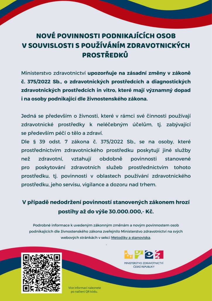 Podnikatelé provozující živnosti, v jejichž rámci jsou využívány zdravotnické prostředky k neléčebným účelům, tj. především k péči o tělo a zdraví (např. kosmetické služby, masérské, rekondiční a regenerační služby, činnosti, při kterých je porušována integrita lidské kůže), jsou v souladu s § 39 odst. 7 zákona č. 375/2022 Sb., o zdravotnických prostředcích a diagnostických zdravotnických prostředcích in vitro, povinni plnit obdobné povinnosti vztahující se k použití zdravotnického prostředku jako poskytovatelé zdravotních služeb – a to zejména povinnosti v oblastech používání zdravotnického prostředku, jeho servisu a vigilance (tzn. povinnosti v rámci šetření nežádoucích příhod souvisejících s použitím zdravotnického prostředku). V případě nedodržení povinností stanovených zákonem hrozí postihy až do výše 30 000 000,- Kč.