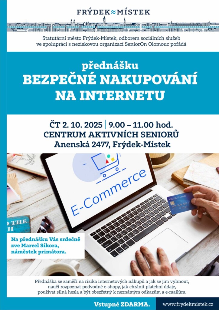 Ve čtvrtek 2. října 2025 zveme všechny seniory do Centra aktivních seniorů v Místku, Anenská 2477, kde proběhne od 9.00 do 11.00 hodin přednáška na téma BEZPEČNÉ NAKUPOVÁNÍ NA INTERNETU.