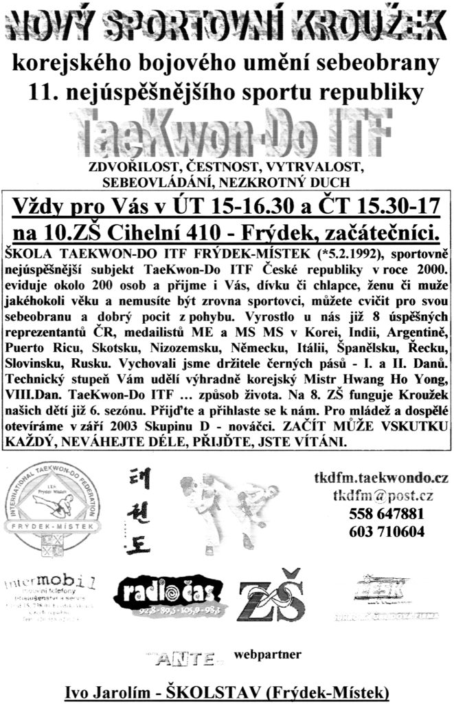 Již každoročně poskytuje Škola korejského bojového umění TaeKwon-Do ITF FRÝDEK-MÍSTEK šanci začít se věnovat sebeobraně, a dětem a mládeži nabízí sportovní aktivitu. O široké nabídce tohoto v roce 2000 sportovně nejúspěšnějšího klubu TaeKwon-Do ITF v České republice se můžete dočíst na stránkách