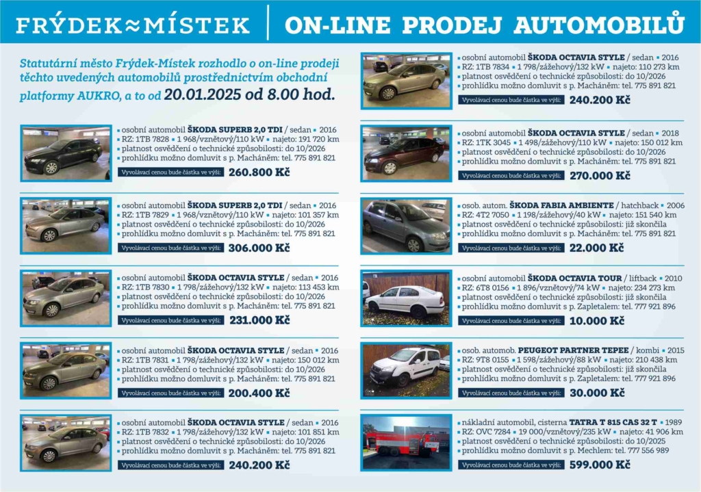 Statutární město Frýdek-Místek pořádá od pondělí 20. ledna 2025 od 8 hodin on-line prodej automobilů prostřednictvím obchodní platformy AUKRO.