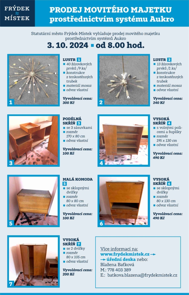 Statutární město Frýdek-Místek pořádá on-line prodej movitého majetku prostřednictvím obchodní platformy AUKRO.