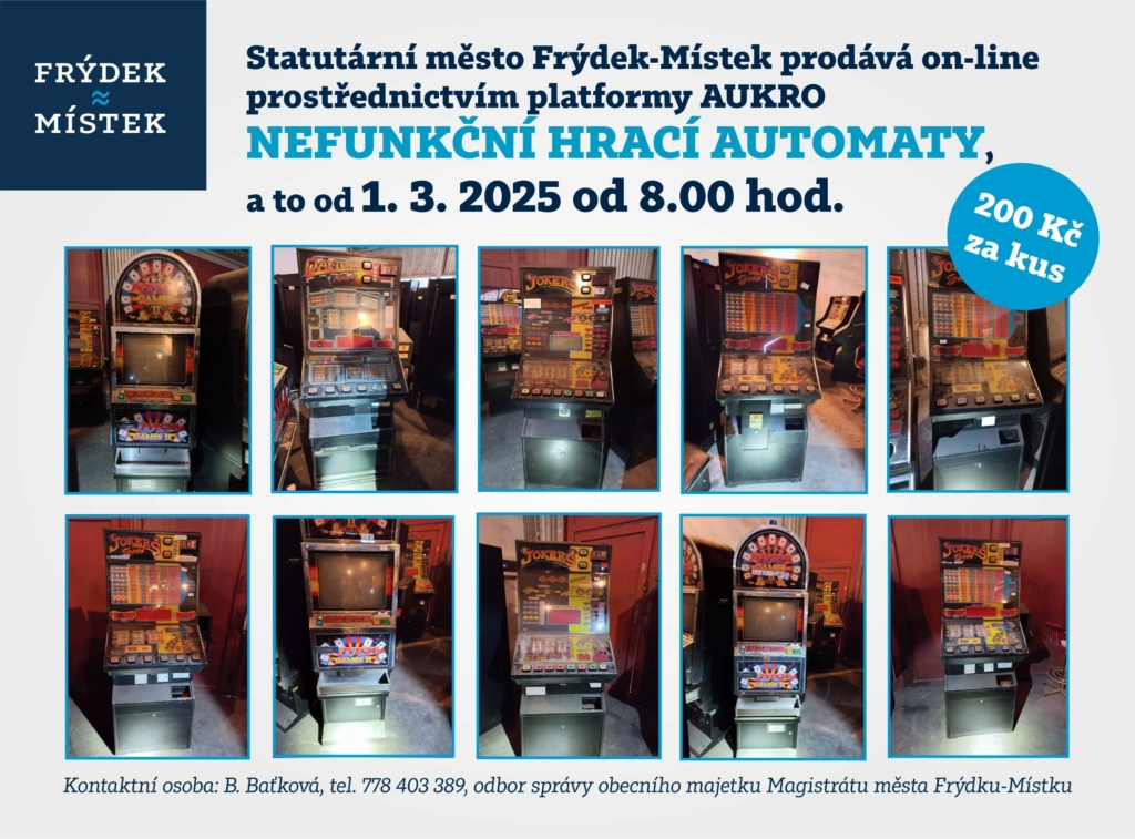 Statutární město Frýdek-Místek pořádá od 1. 3. 2025 od 8 hodin on-line prodej nefunkčních hracích automatů prostřednictvím obchodní platformy AUKRO.