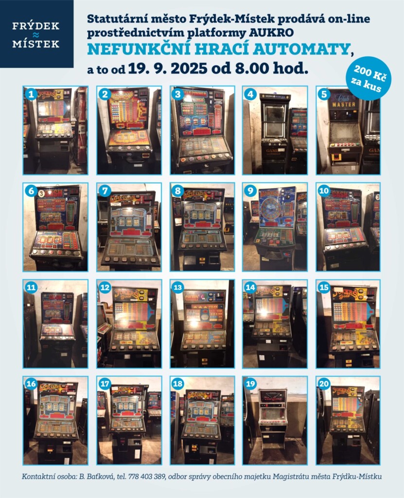 Statutární město Frýdek-Místek pořádá od 19. 9. 2025 od 8 hodin on-line prodej nefunkčních hracích automatů prostřednictvím obchodní platformy AUKRO.