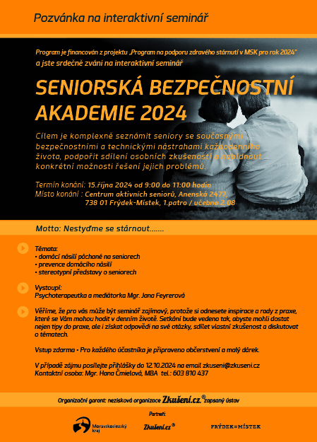 Srdečně Vás zveme na interaktivní seminář SENIORSKÁ BEZPEČNOSTNÍ AKADEMIE 2024. Cílem je komplexně seznámit seniory se současnými bezpečnostními a technickými nástrahami každodenního života, podpořit sdílení osobních zkušeností a nabídnout konkrétní možnosti řešení jejich problémů. Prostor bude také na Vaše otázky, sdílení vlastních zkušeností a diskuze o tématech.