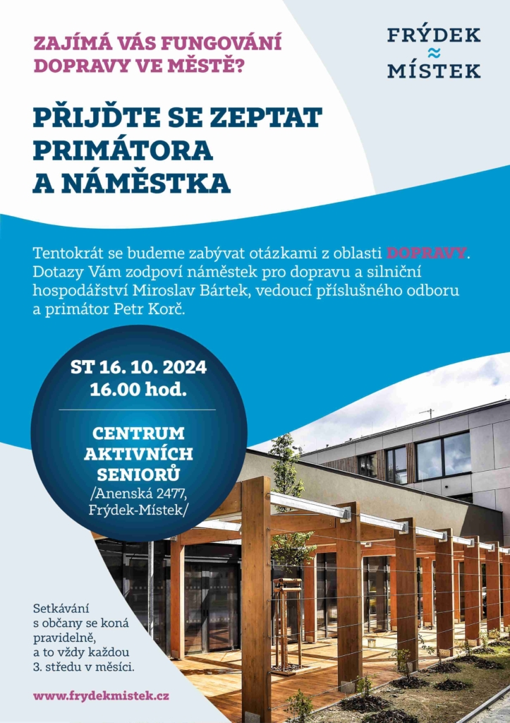 Zveme Vás na další setkání vedení města s občany, které se bude konat 16. října 2024 od 16 hodin v Centru aktivních seniorů, Anenská 2477 v Místku. Tentokrát se budeme zabývat otázkami z oblasti DOPRAVY. Vaše dotazy Vám zodpoví náměstek pro dopravu a silniční hospodářství Miroslav Bártek, vedoucí příslušného odboru a primátor Petr Korč.