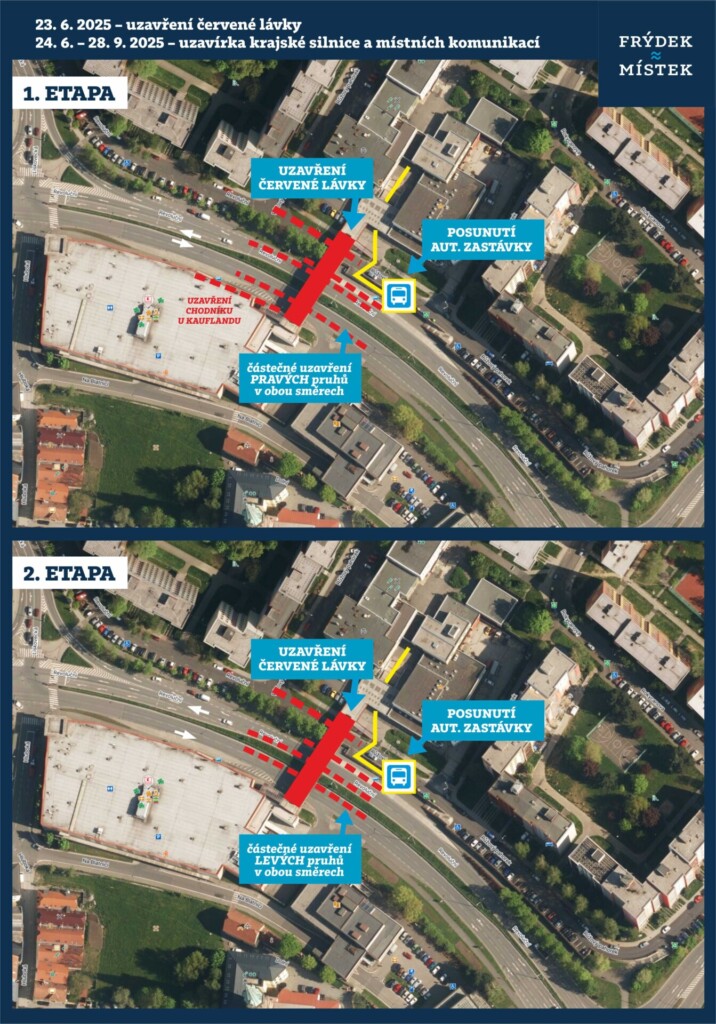 - Po dokončení opravy první fáze přichází na řadu fáze druhá – dokončení opravy lávky. Dojde k zprůchodnění chodníku pod lávkou vedle Kauflandu, komunikace Růžový pahorek a přilehlý chodník budou nadále uzavřeny. Na krajské silnici budou uzavřeny vnitřní jízdní pruhy.