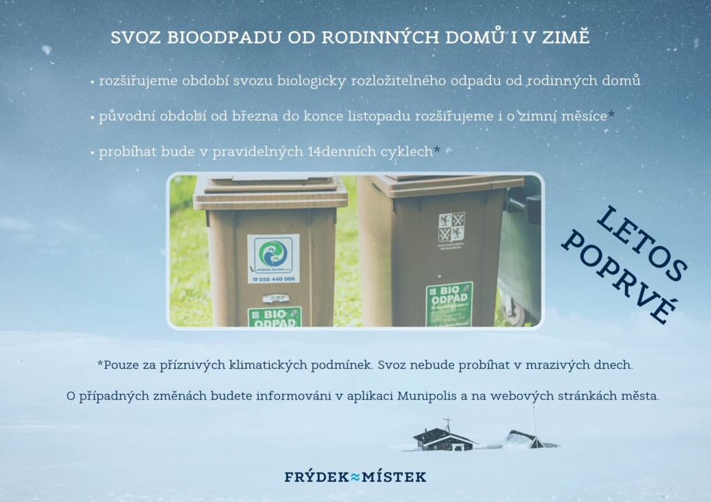 Svoz bioodpadu, který nyní probíhá klasicky od března do listopadu rozšiřujeme poprvé i o zimní měsíce. Bude probíhat v pravidelných 14denních cyklech a za příznivých klimatických podmínek.