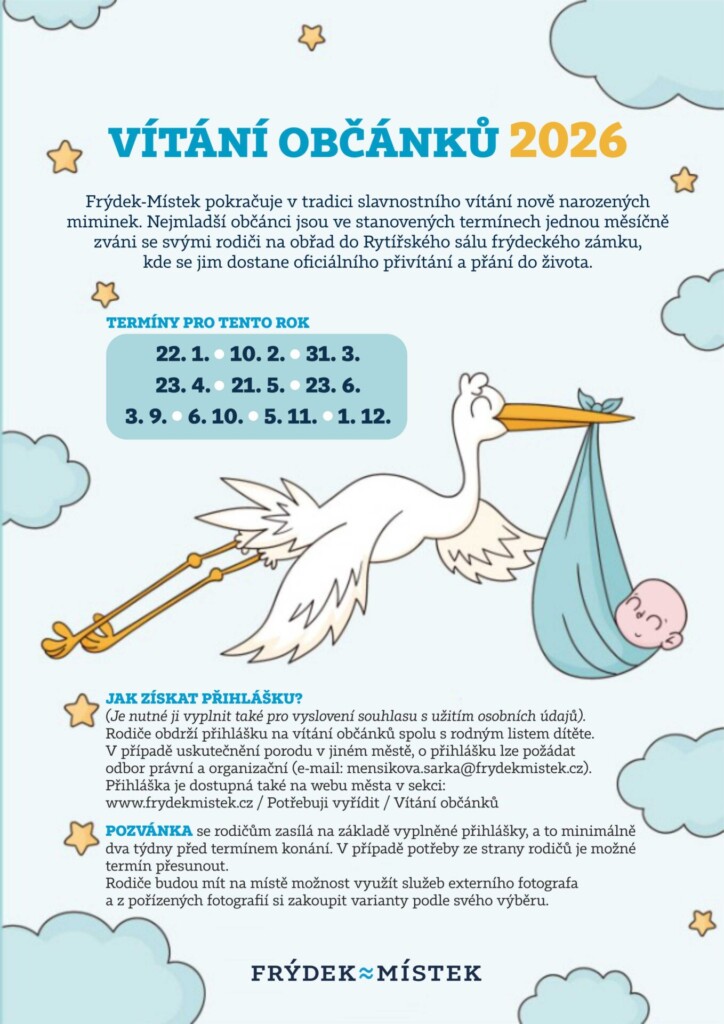 Rodiče obdrží přihlášku na vítání občánků spolu s rodným listem dítěte. V případě uskutečnění porodu v jiném městě, o přihlášku lze požádat odbor právní a organizační (kontakt viz níže). Přihláška je dostupná také na webu města: Vítání občánků | Frýdek-Místek
