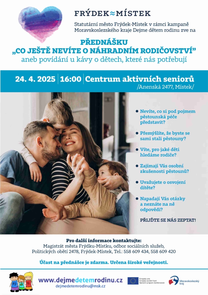 Statutární město Frýdek-Místek v rámci kampaně Moravskoslezského kraje „Dejme dětem rodinu“ vás zve na přednášku „CO JEŠTĚ NEVÍTE O NÁHRADNÍM RODIČOVSTVÍ“ aneb povídání u kávy o dětech, které nás potřebují.