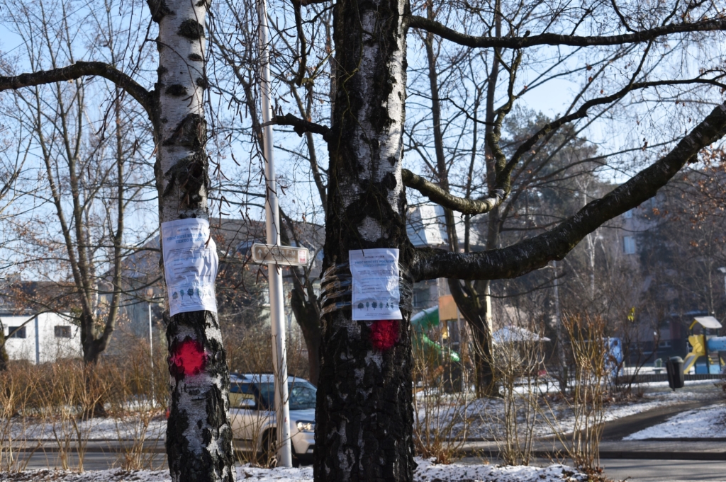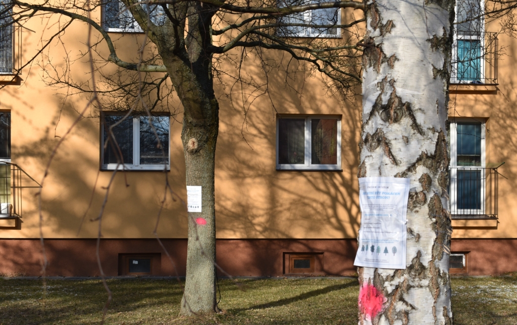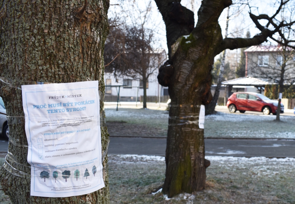 Aby občané byli informováni o kácení, investor umístil na jednotlivé stromy informační cedule.