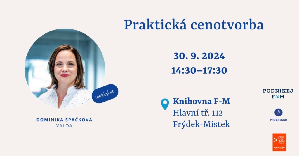Díky podpoře města Frýdek-Místek je pro účastníky workshop ZDARMA. Vzhledem k omezené kapacitě je nutná registrace předem na tomto odkaze Praktická cenotvorba – Progresko.