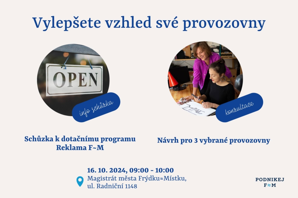 Město Frýdek-Místek i letos umožňuje podnikatelům získat finanční podporu ve výši až 30 000,- na zřízení nové cedule nebo označení provozovny a to v rámci dotačního titulu Reklama F-M. Podnikatelé, kteří by si rádi o dotaci zažádali, mají možnost díky podpoře města, navštívit zdarma informační schůzku k dotaci, která se uskuteční ve středu 16. října od 9 hodin v budově magistrátu.