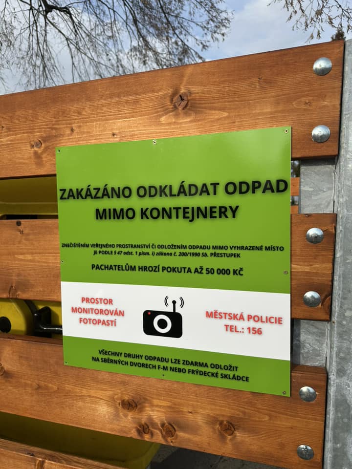 Ve spolupráci s městskou policií bude prostor sledován fotopastmi. Objemný a nebezpečný odpad nelze odkládat vedle kontejnerů – patří na Frýdeckou skládku či do sběrných dvorů, kde jej můžete odložit zcela ZDARMA.
