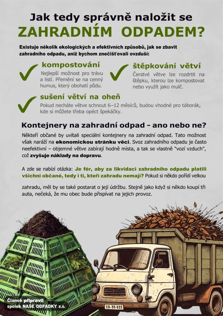 - Vlhké, čerstvě pokosené, ustřižené traviny či dřevo se likvidují pouze kompostováním nebo vyhozením do speciálního kontejneru. (Je možné jej odevzdat také v areálu skládky na Panských Nových Dvorech.)