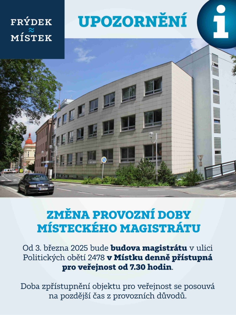Z provozních důvodů bude od 3. března 2025 budova magistrátu v ulici Politických obětí v Místku denně přístupná pro veřejnost od 7.30 hodin.