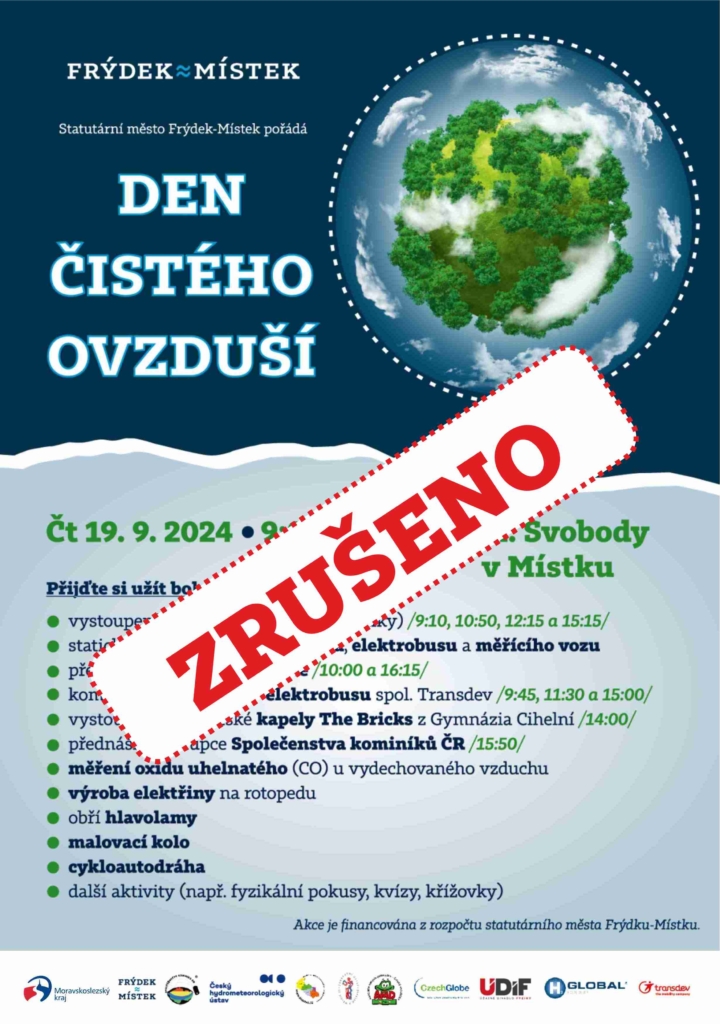 vzhledem k aktuální situaci v souvislosti s povodněmi jsme se rozhodli zrušit připravenou akci Den čistého ovzduší 2024. Akce byla určena nejen pro školáky, ale byla na ni zvána také široká veřejnost, která nyní řeší následky působení velké vody, proto se 19. září neuskuteční.