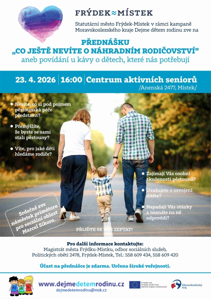 Vaše dotazy ohledně pěstounství zodpovíme 23. dubna 2026 od 16 hodin v Centru aktivních seniorů v Místku.