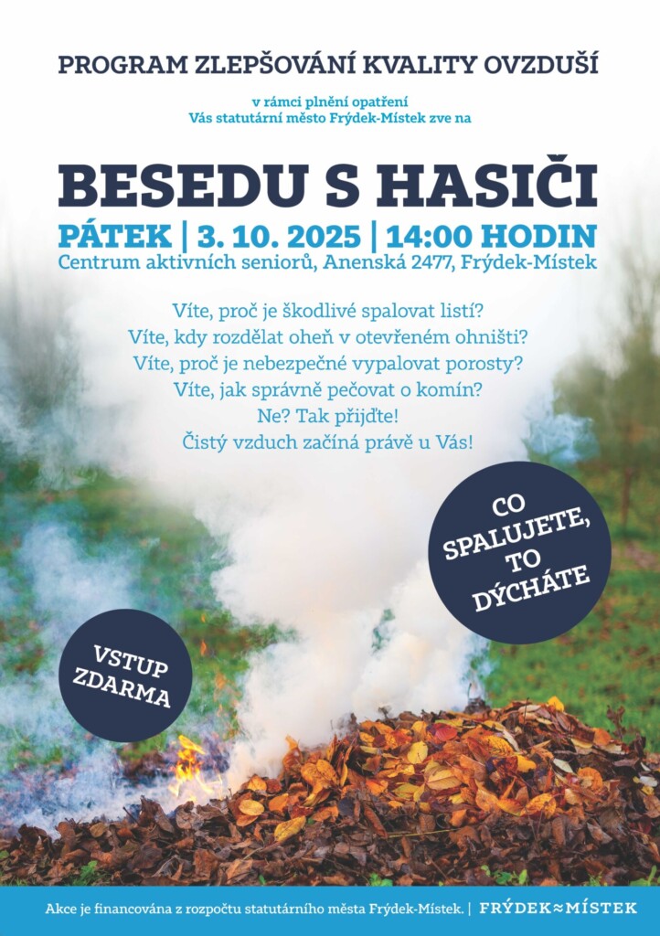 Ačkoliv se beseda zaměří hlavně na ovzduší, řeč přijde i na požární prevenci. „Jediná jiskra v suché trávě nebo její záměrné vypalování se může rozrůst do požáru obřích rozměrů. Nemusí jít zrovna o katastrofu takového rozsahu, jako byl požár, který zasáhl České Švýcarsko, největší lesní požár v moderní historii Česka. K případům, kdy popelem lehne celá louka a část lesa, bohužel dochází i v našem regionu a všechny většinou začínají s dobrým úmyslem,“ upozornil náměstek primátora pro bezpečnostní rizika, ochranu veřejného pořádku a požární ochranu Lukáš Kmec (ANO 2011).