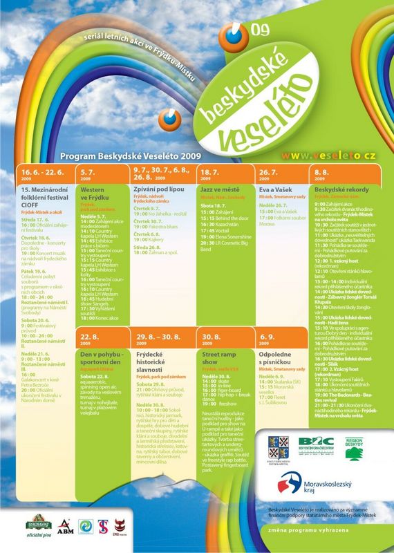 V programu Beskydského Veseléta nechybí tradiční Mezinárodní folklórní festival, dětmi oblíbený Western ve Frýdku, nebo atmosférou přímo nabitý Jazz ve městě. Na své posluchače se rovněž těší oblíbené Zpívání pod Lípou nebo pohodové Odpoledne s písničkou. Mezi letošní novinky patří akce Beskydské rekordy, která je zasvěcena soutěžím a zábavě, stejně jako sportovně laděný Den v pohybu na Olešné a nebo Street ramp show, která nadchne nejen milovníky kolečkových sportů. Své publikum jistě nezklame ani dvojice Eva a Vašek a letní prázdniny zakončí tradičně Frýdecké historické slavnosti. (více o programu na www.veseleto.cz nebo na www.frydekmistek.cz – odkaz v levém svislém sloupci)