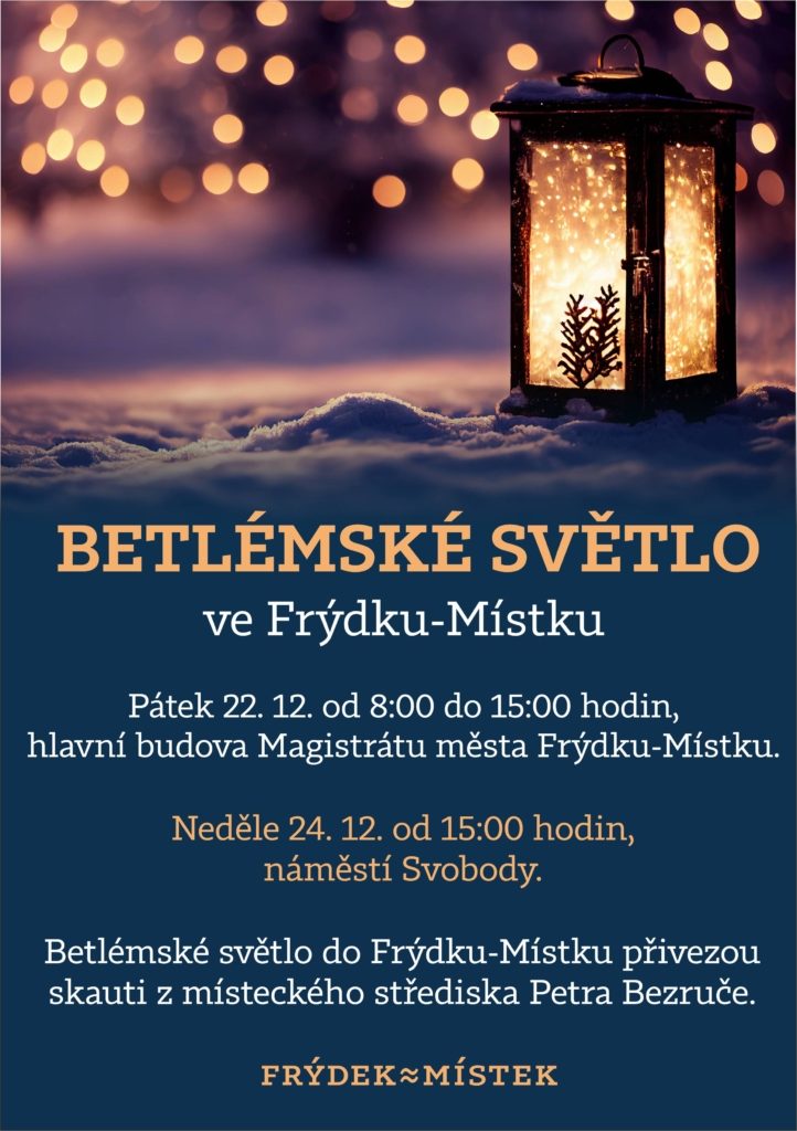 Plamínek doputuje do Frýdku-Místku z jeskynní kaple v Betlémě, v níž se narodil Ježíš Kristus. Z Betléma bude světlo letecky převezeno do Vídně a odtamtud skauty rozváženo vlaky po Evropě.