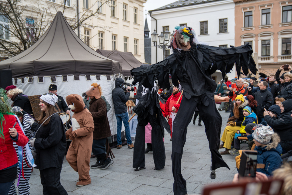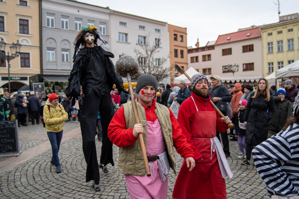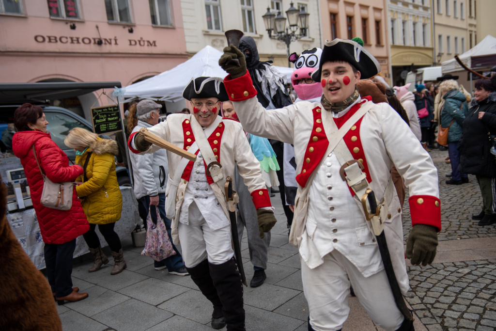 9.00 Zahájení Masopustu, 1. Masopustní průvod – předání masopustního práva chase purkmistrem města FM – Masopustní průvod okolo rynku -Vynášení prasátka a vyprávění Řezníka Krkovičky