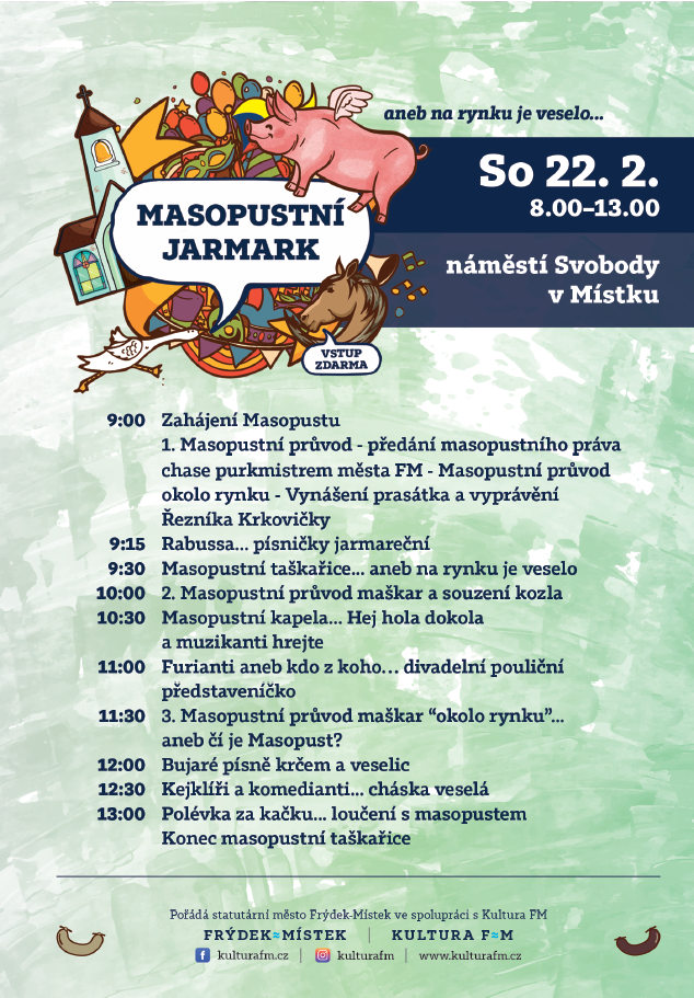Akci MASOPUSTNÍ JARMARK aneb Na rynku je veselo pořádá statutární město Frýdek-Místek prostřednictvím Kultura FM a vstup na ni je zdarma.