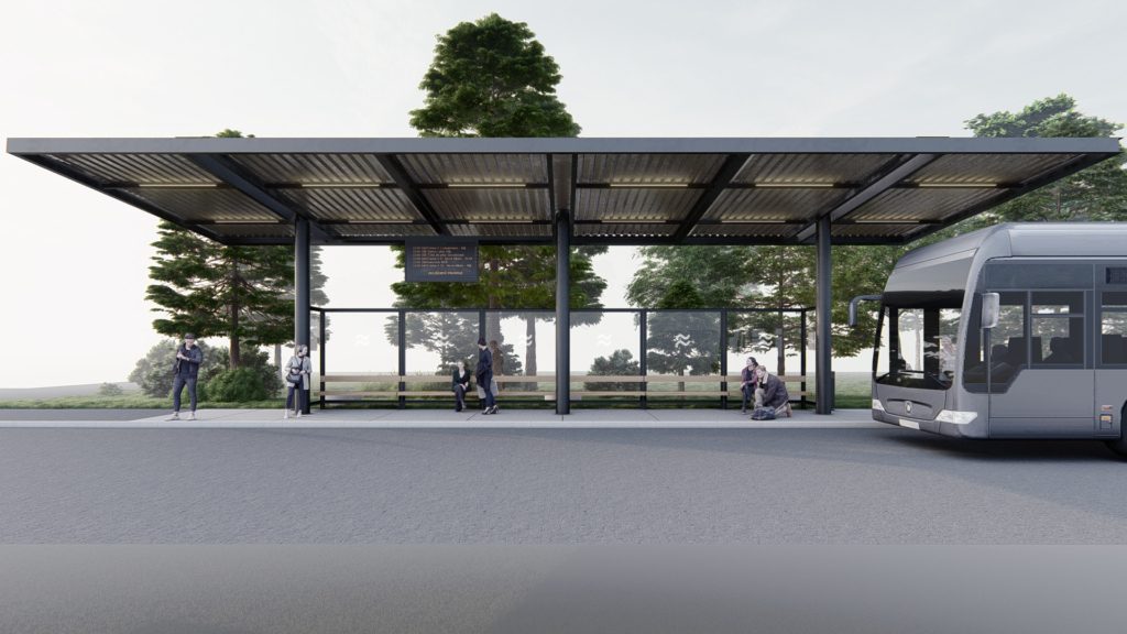 Vizualizace zastávky s LED tabulí na bývalém autobusovém stanovišti.