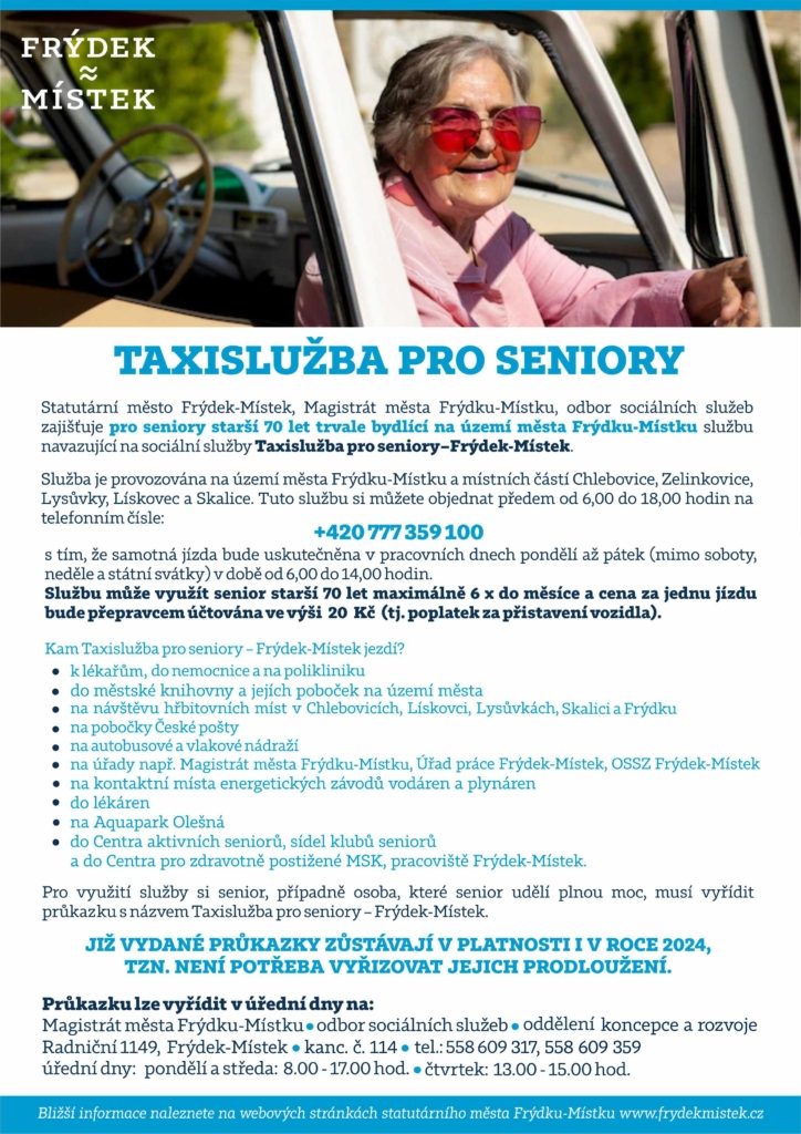 Seniortaxi ve Frýdku-Místku se těší stále většímu zájmu. Službu města určenou pro nejstarší občany vloni využilo na 400 zájemců. Letos pokračuje s jiným dopravcem za totožných podmínek.