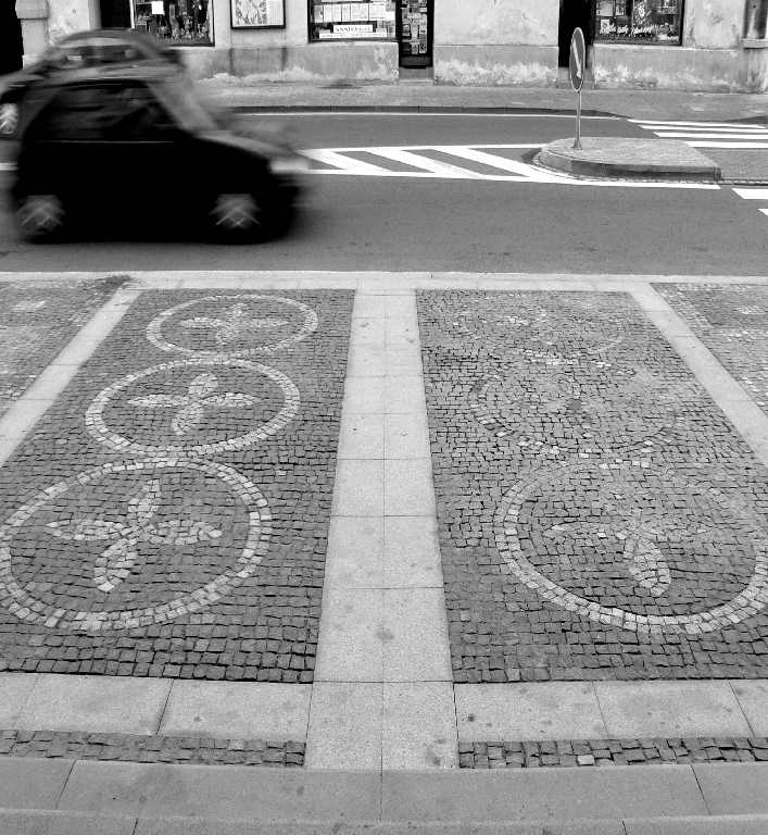 Varovný a signální pás pro zrakově postižené byl u přechodu pro chodce vytvořen ze světlých žulových desek s tmavou výplní.