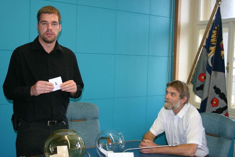 Losující – vedoucí odboru vnitřních věcí Radovan Horák, přihlížející – zmocněnec ODS Miloslav Merta